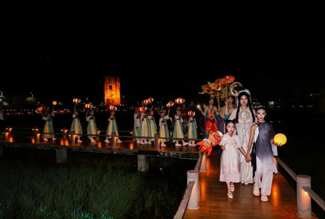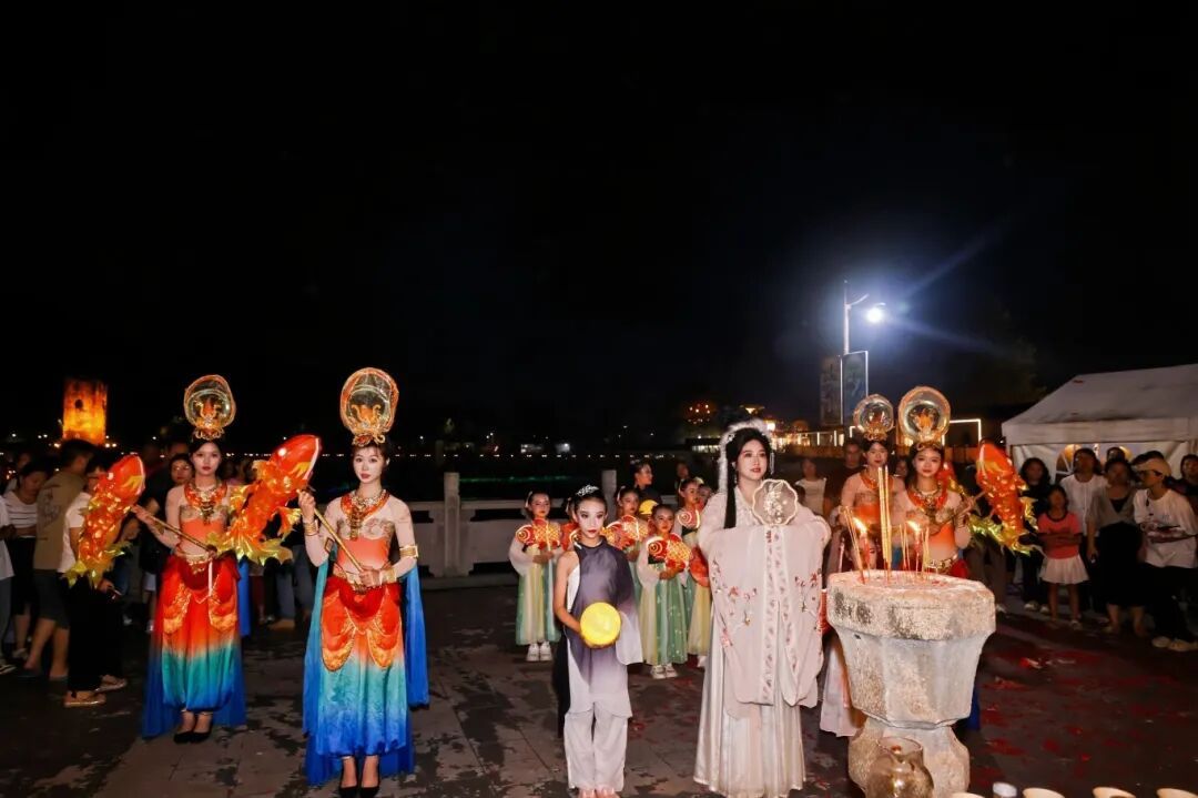 当晚,曹边武侯殿前率先开启庄严的拜月仪式,参与者身着传统服饰,依循古礼敬月、祈福,沉浸式感受“中秋祭月”的文化魅力。仪式落幕,主舞台区随即奏响《曹边遥》,婉转歌声勾勒出古村灵动风貌,正式拉开晚会帷幕。