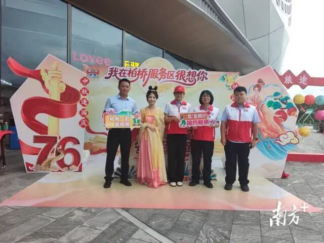 服务区运营管理处与茂湛公司包茂营运管理处的志愿者穿梭在人群中,热情地指引旅客前往下一个打卡点。园林水池边,波光粼粼,倒映着游人开心的笑脸;充满荔乡风情的景观天桥上,旅客纷纷驻足留影。