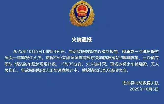 霞浦县消防救援大队发布火警通报称,2025年10月5日13时54分许,消防救援指挥中心接到报警,霞浦县三沙镇东壁村码头一车辆发生火灾。指挥中心立即调派霞浦县东关消防救援站2辆消防车、三沙镇专职队1辆消防车赶赴现场扑救。15时35分许,火灾被扑灭。现场多辆小车被烧毁,无人员伤亡。事故原因和损失正在调查统计中,后续情况以官方通报为准。